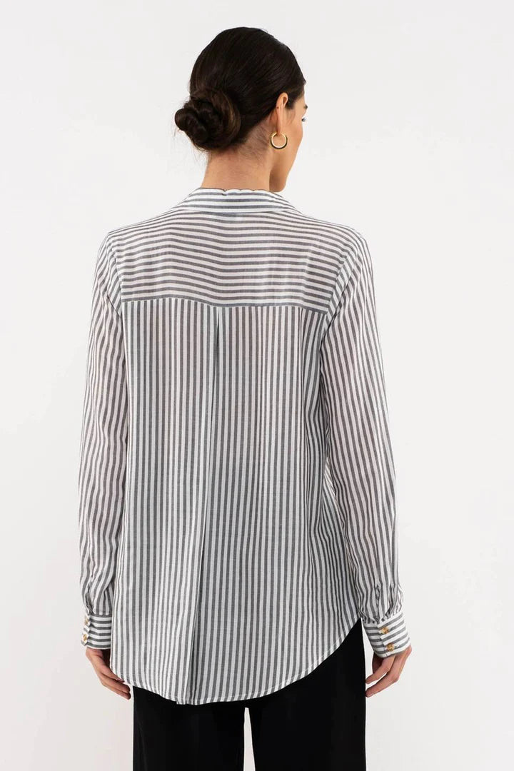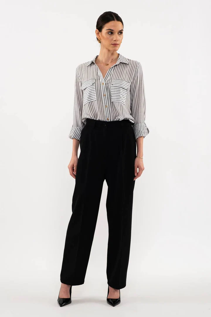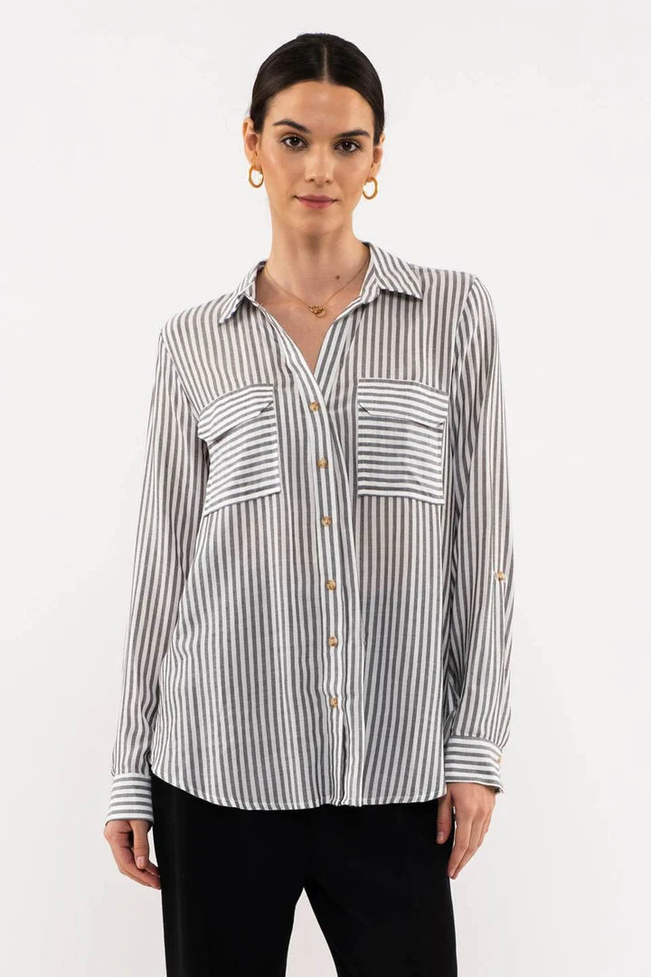 A classic, chic button down lightweight top that is a perfect closet staple. It features a striped pattern, long sleeves with button cuffs, a back yoke, and two front pockets. Comes in a black and white color.