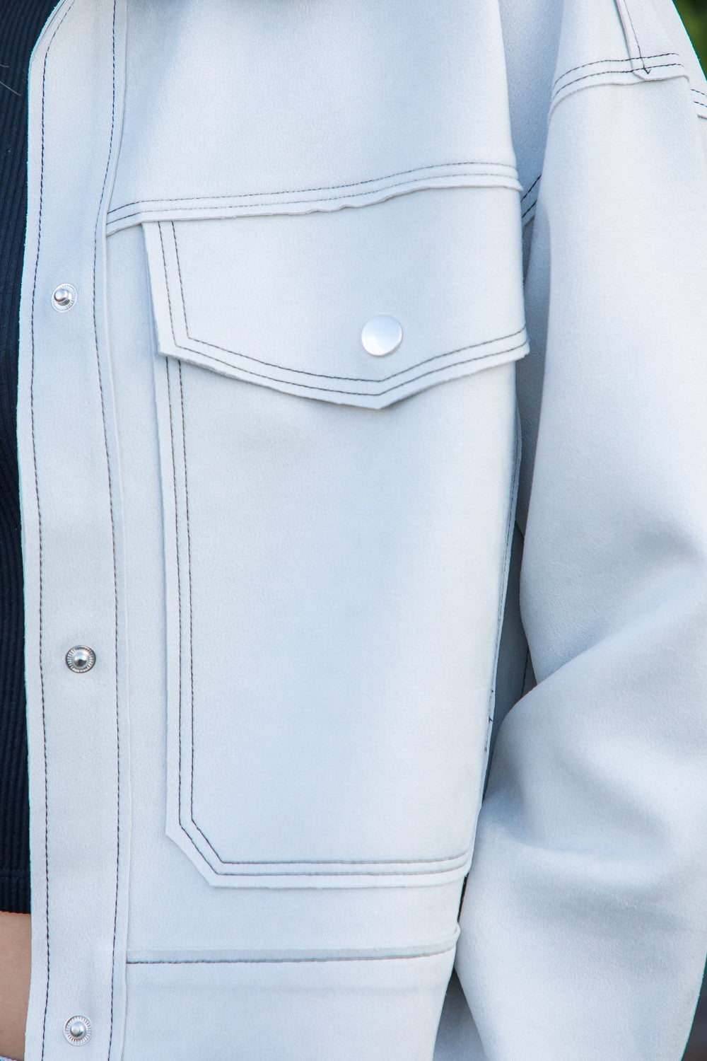 This regular-size crop trucker jacket is the perfect mix of classic and modern style. Made from soft suede fabric, it features long sleeves with button cuffs, a classic collar, and front flap pockets with button details. The front snap button closure adds a sleek finish. Lightweight and versatile, it’s an easy go-to for layering!