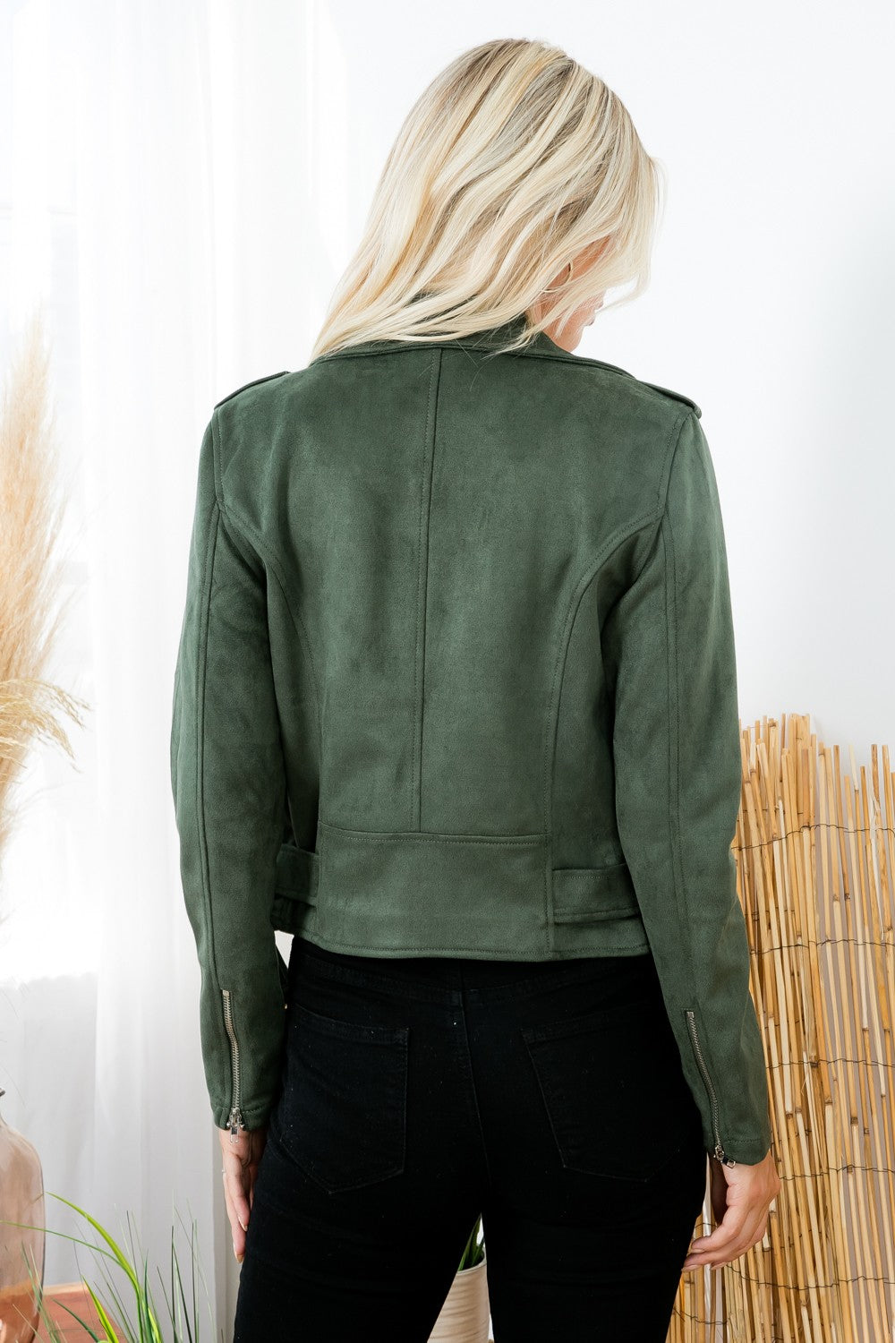 Made with vegan suede, this jacket features long sleeves, functional zipper pockets, and a front zipper closure with a waist belt for a stylish and functional fit. Perfect for adding a touch of edginess to any outfit!