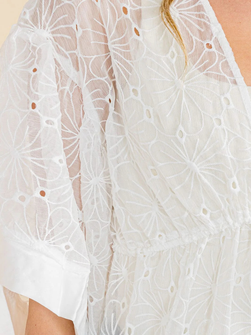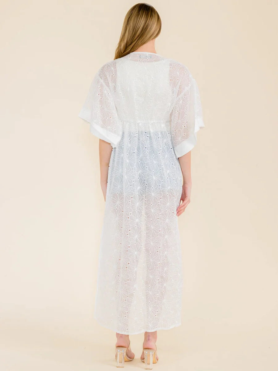 This lightweight kimono features short, wide sleeves and a self-tie waist, offering a relaxed, airy fit. With a delicate eyelet design and crisp white color, it’s the perfect layer to add a touch of elegance and breeziness to any outfit.