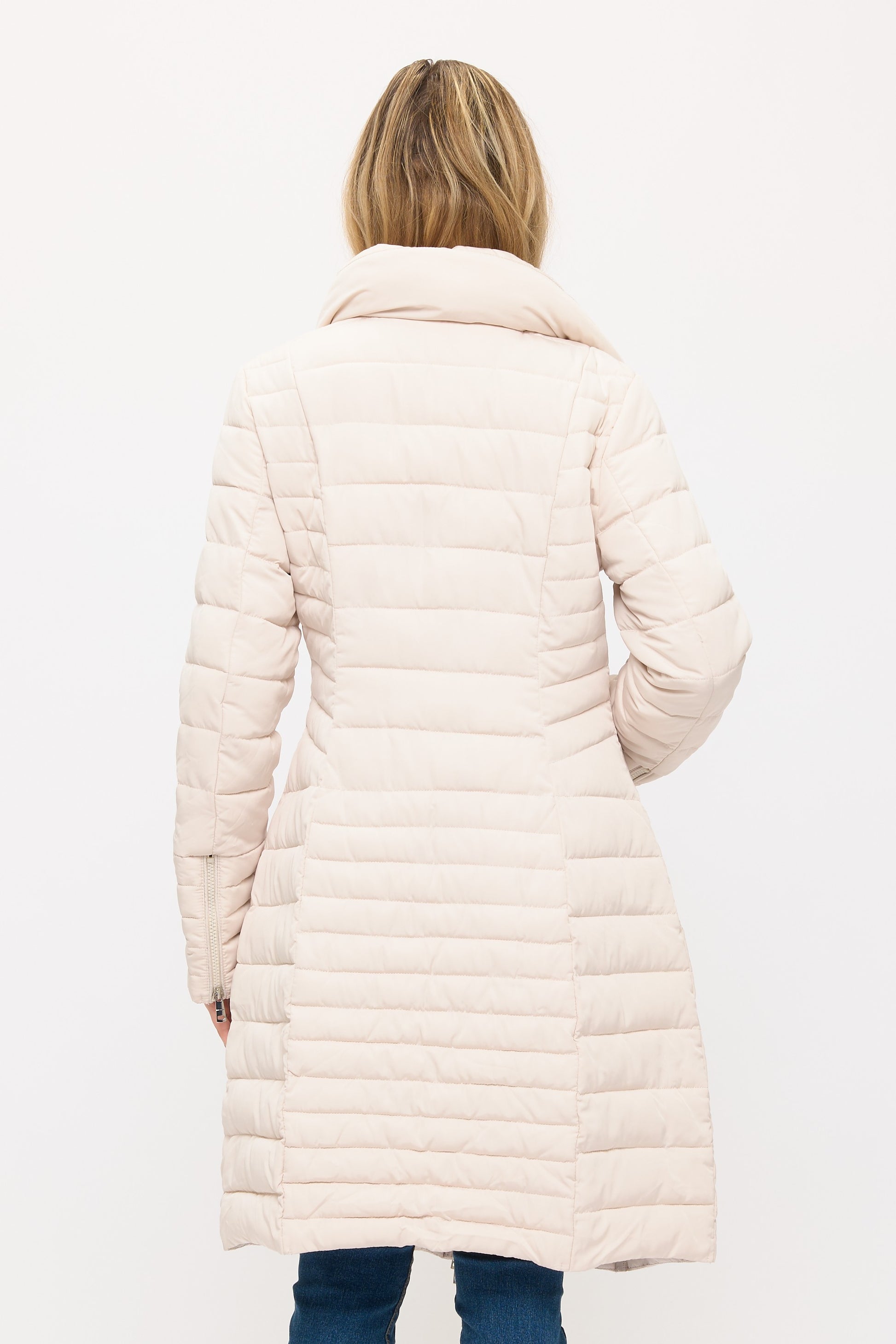 This streamlined puffer coat combines exceptional warmth with a sophisticated silhouette. The fitted design and horizontal quilting create a flattering hourglass shape while maintaining lightweight comfort. A practical hood and full-zip closure offer protection from the elements, and strategic seaming enhances the feminine form. Premium insulation provides superior warmth without bulk, while the knee-length cut ensures extended coverage. Zippered side pockets complete the look with sleek, functional detail.