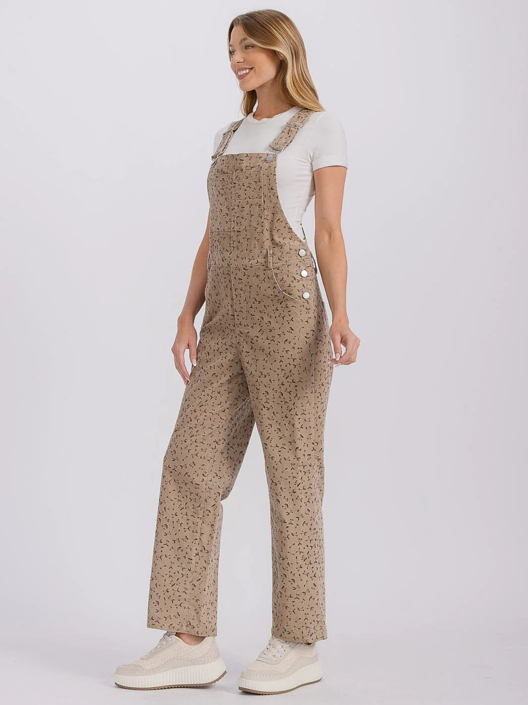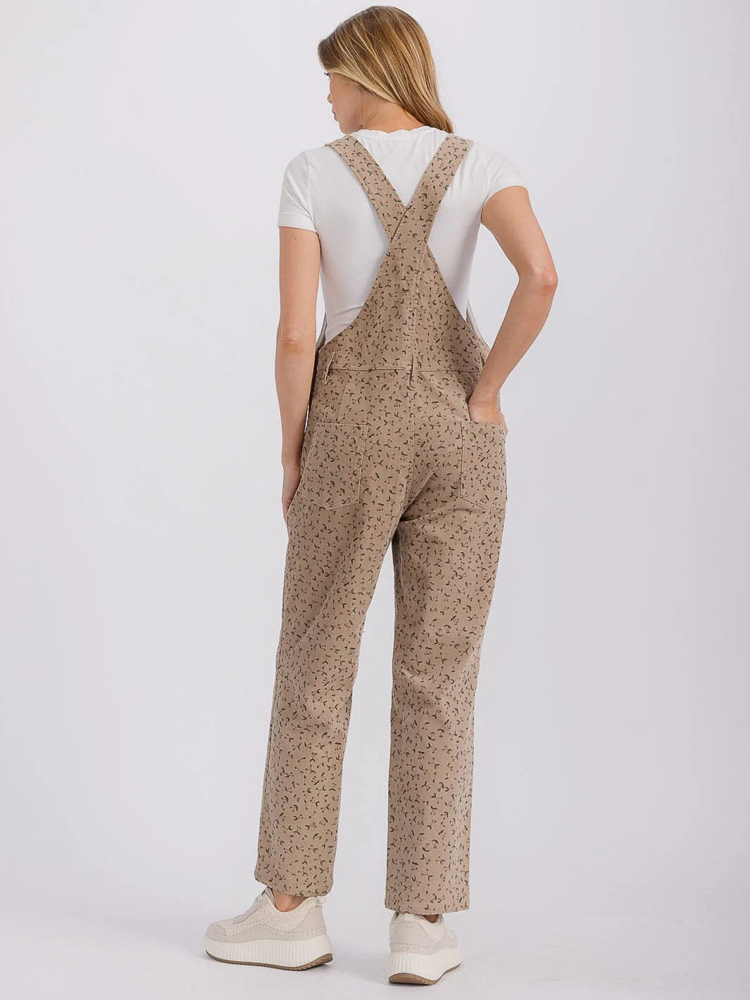 A fresh twist on a timeless style — these cherry print overalls bring playful charm with a unique neutral backdrop. The soft tan base lets the delicate cherry pattern pop, creating a look that’s both eye-catching and easy to wear.