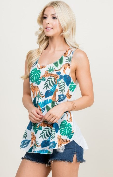 A lightweight and comfortable tank with a fun tropical leaf and jaguar jungle print.