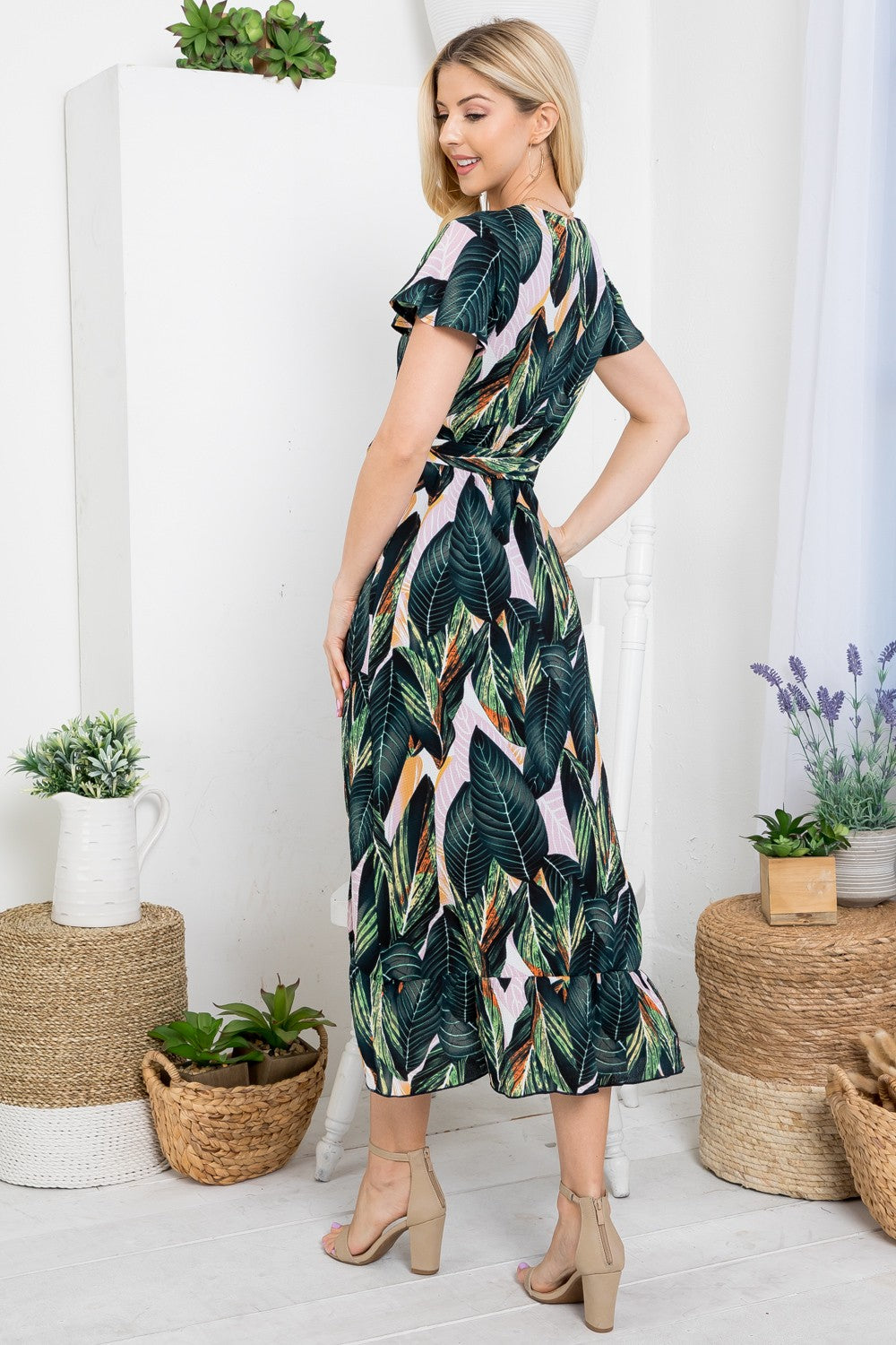 Get ready for some tropical vibes with this leafy print wrap dress! Its elastic waist and frill hemline add a flirty touch, while the included belt cinches your waist for a flattering silhouette. Perfect for a day at the beach or a summer party, this dress will have you feeling like an island goddess.