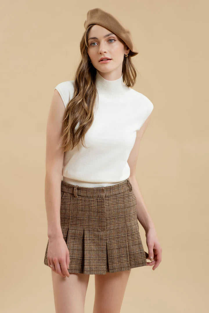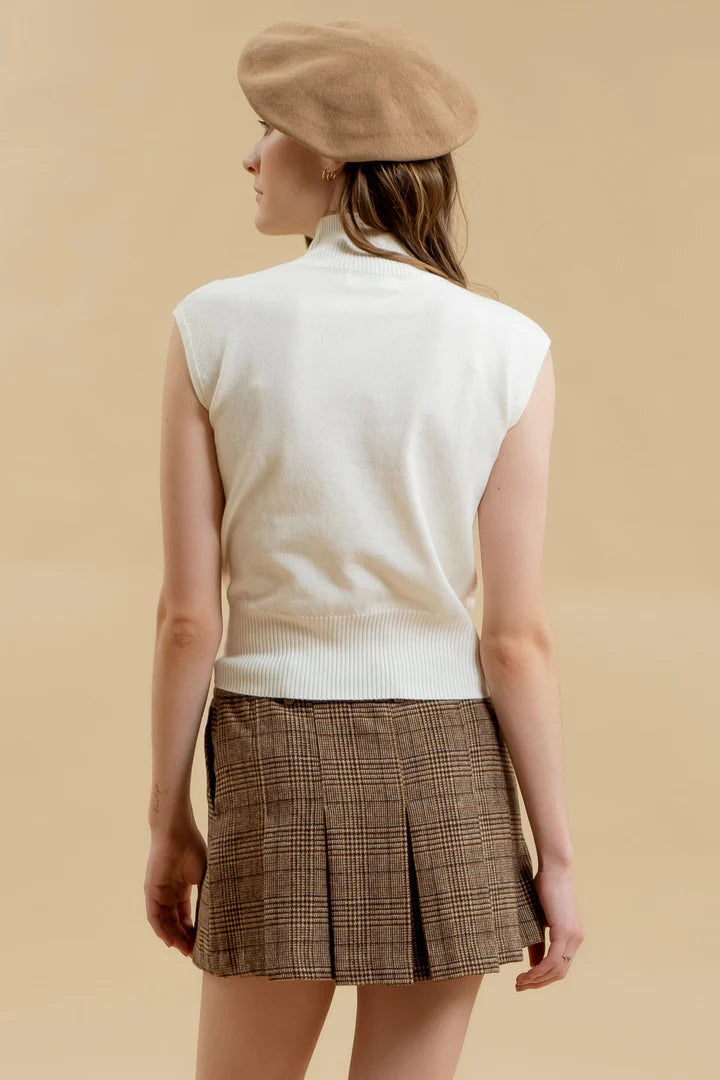This sleeveless ribbed trim shell top is perfect for any occasion. Made from a soft sweater knit and featuring a turtle neck collar, this pullover is a must-have for your wardrobe. Comes in a gorgeous cream color.