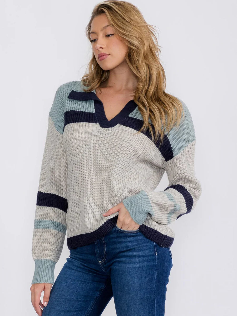 Effortlessly stylish and ultra-comfy, this knit pullover features a relaxed fit and a bold colorblock design. The soft acrylic material and flattering V-neckline make it a go-to piece for layering or wearing solo.