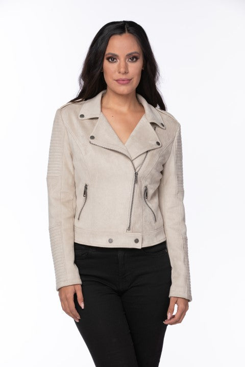 A cute and chic vegan suede moto jacket with snap buttons, ribbed stitching, side zip pockets, asymmetric zip front closure, and a lining.