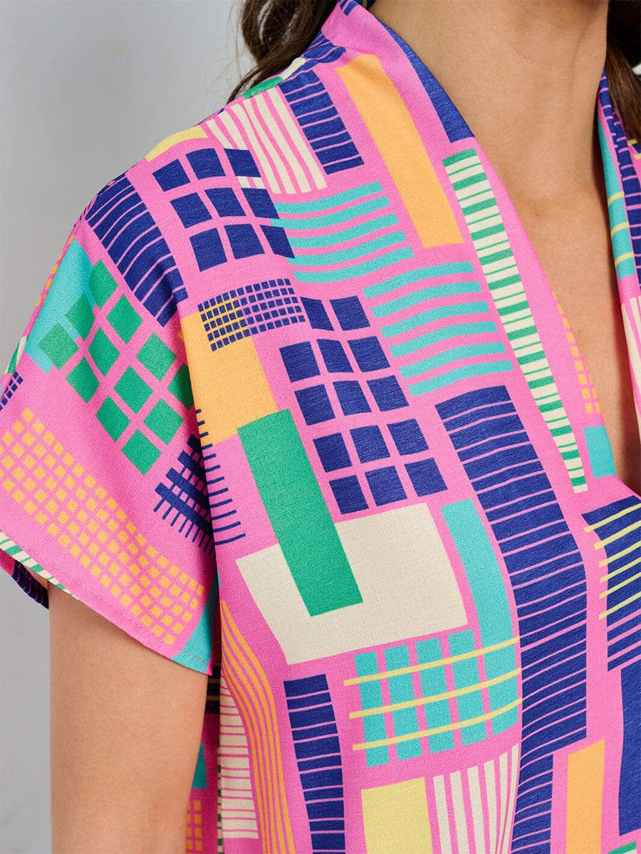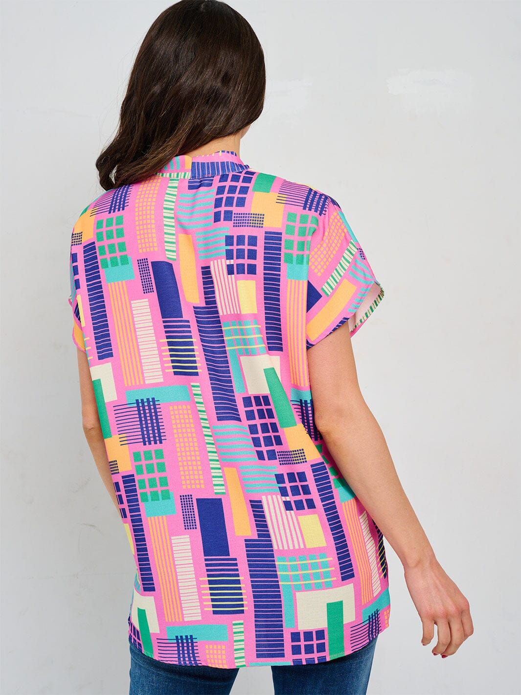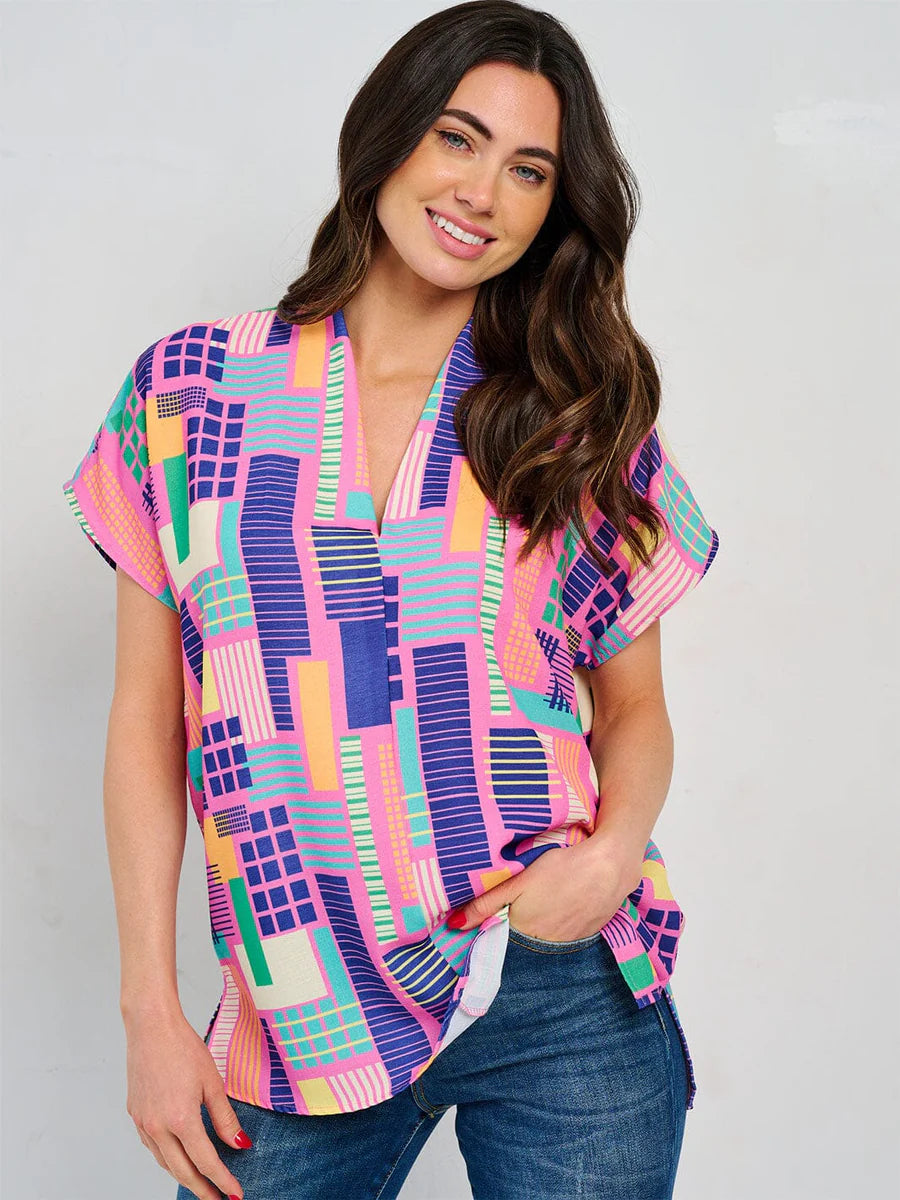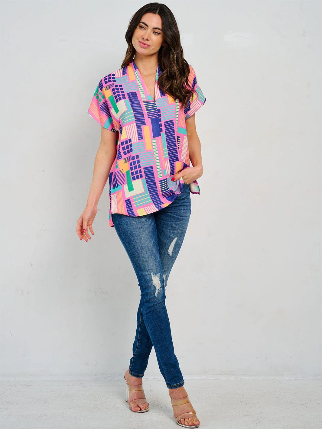 Brighten up your wardrobe with this women’s short sleeve V-neck tunic blouse, designed to stand out with its bold mix of vivid colors and eye-catching geometric print. Lightweight and easy to wear, it’s the perfect piece to bring a pop of personality to any day.