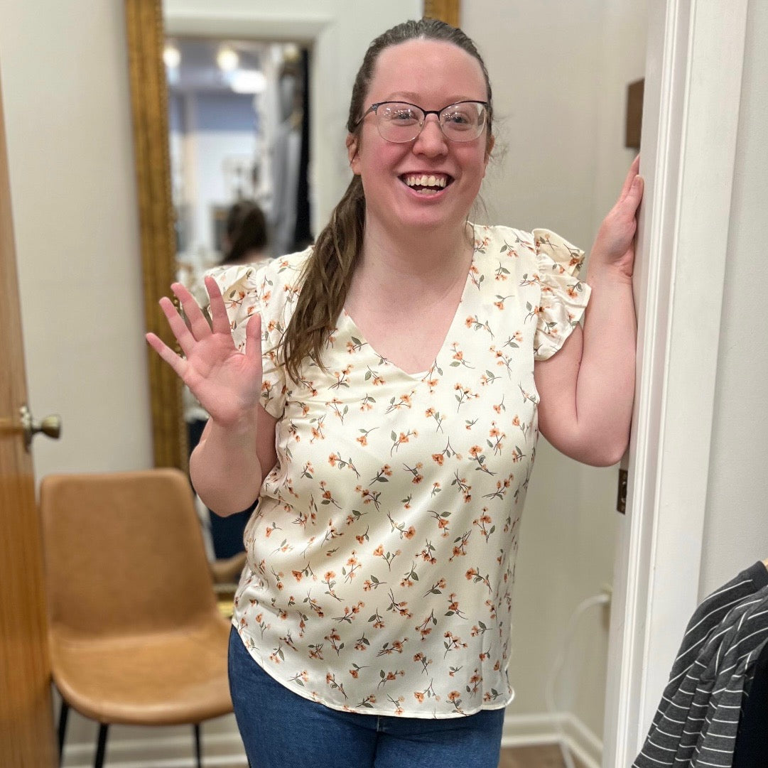 This top features a v-neckline and ruffled sleeves, adorned with a delightful floral motif.