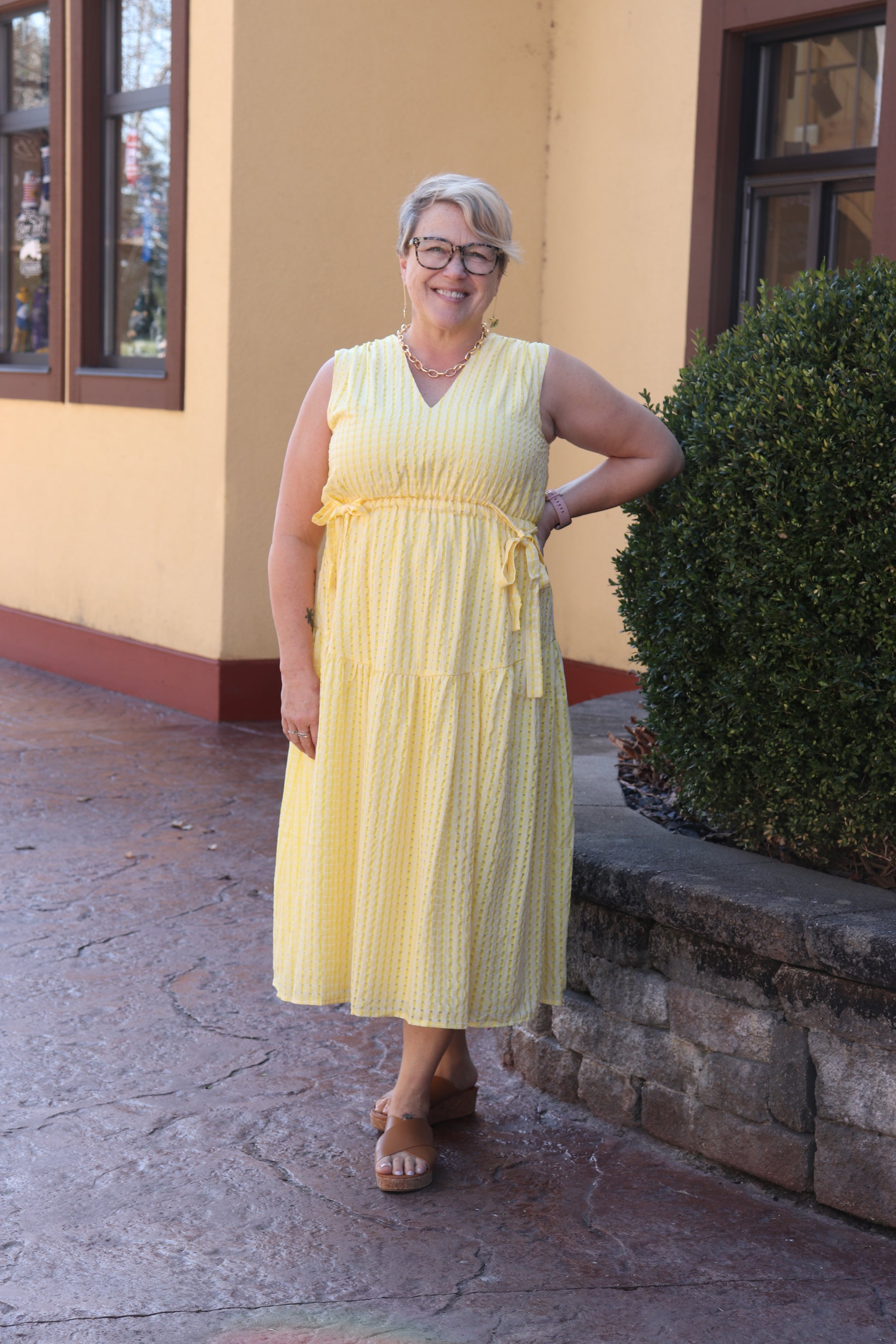 Get ready to turn heads in this playful and fun dress! With a charming bowtie elasticized waist and cute waffle knit fabric, this yellow dress is perfect for any occasion. Plus, the flattering v-neck adds a touch of sass to your look. (You'll definitely want to twirl in this one!)