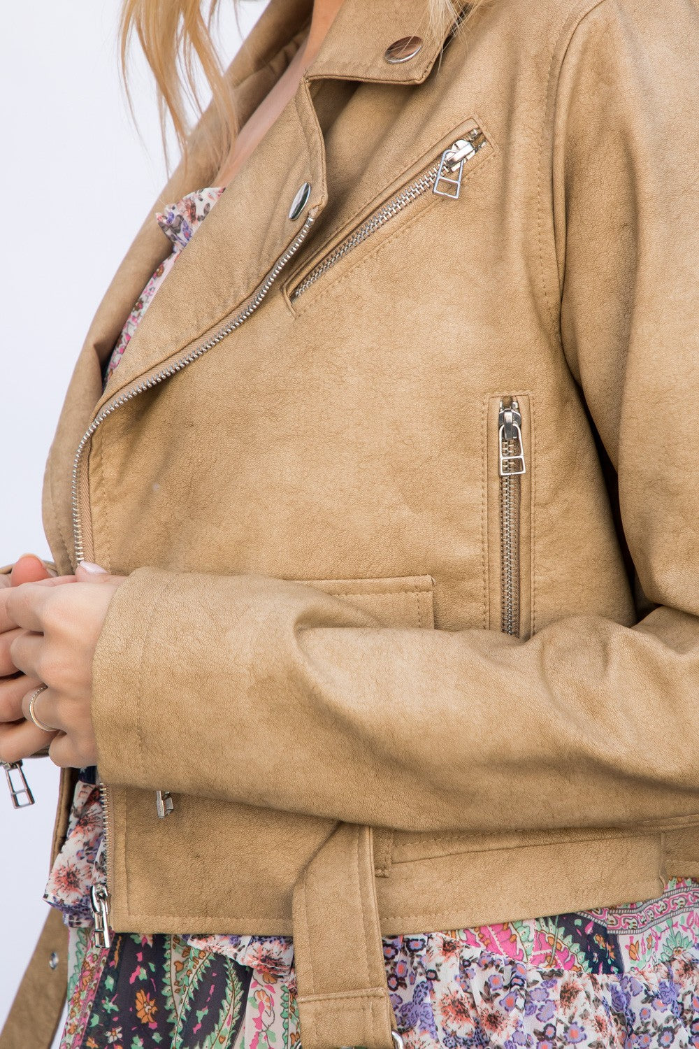 Made with a washed faux leather fabric, this jacket features long sleeves and a waist belt for a sleek fit. Complete with zipper pocket detail, it's the perfect blend of edgy and chic. Comes in a khaki color.