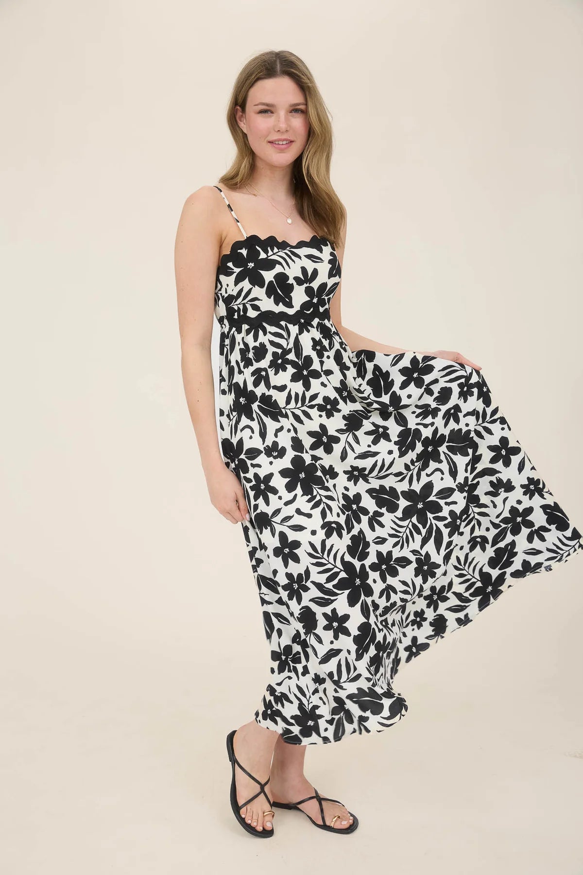 Catch summer vibes in our Wave Trim Back Tie Dress! This playful midi sundress features adjustable spaghetti straps, a flattering empire waist, and a flirty back cut-out with tie detail. The distinctive wavy trim adds a touch of whimsy to the classic black and white color scheme. Perfect for beach days, brunches, or anywhere your adventures take you!