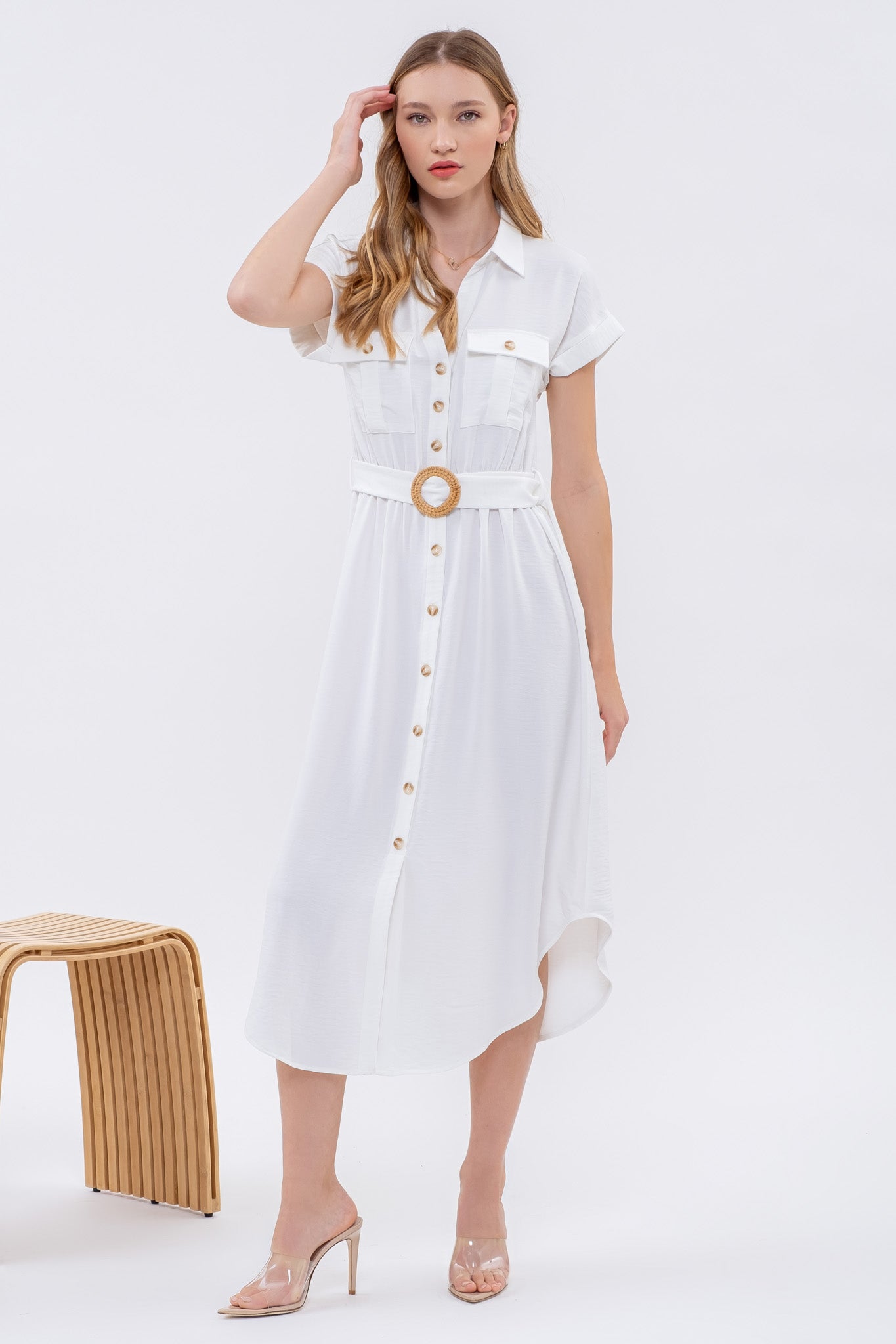 Unleash your inner fashionista with this Button Down Dress. Designed with a collared neckline, short fold sleeves, and convenient pockets, this midi dress comes with a belt and for a cinched waist look.
