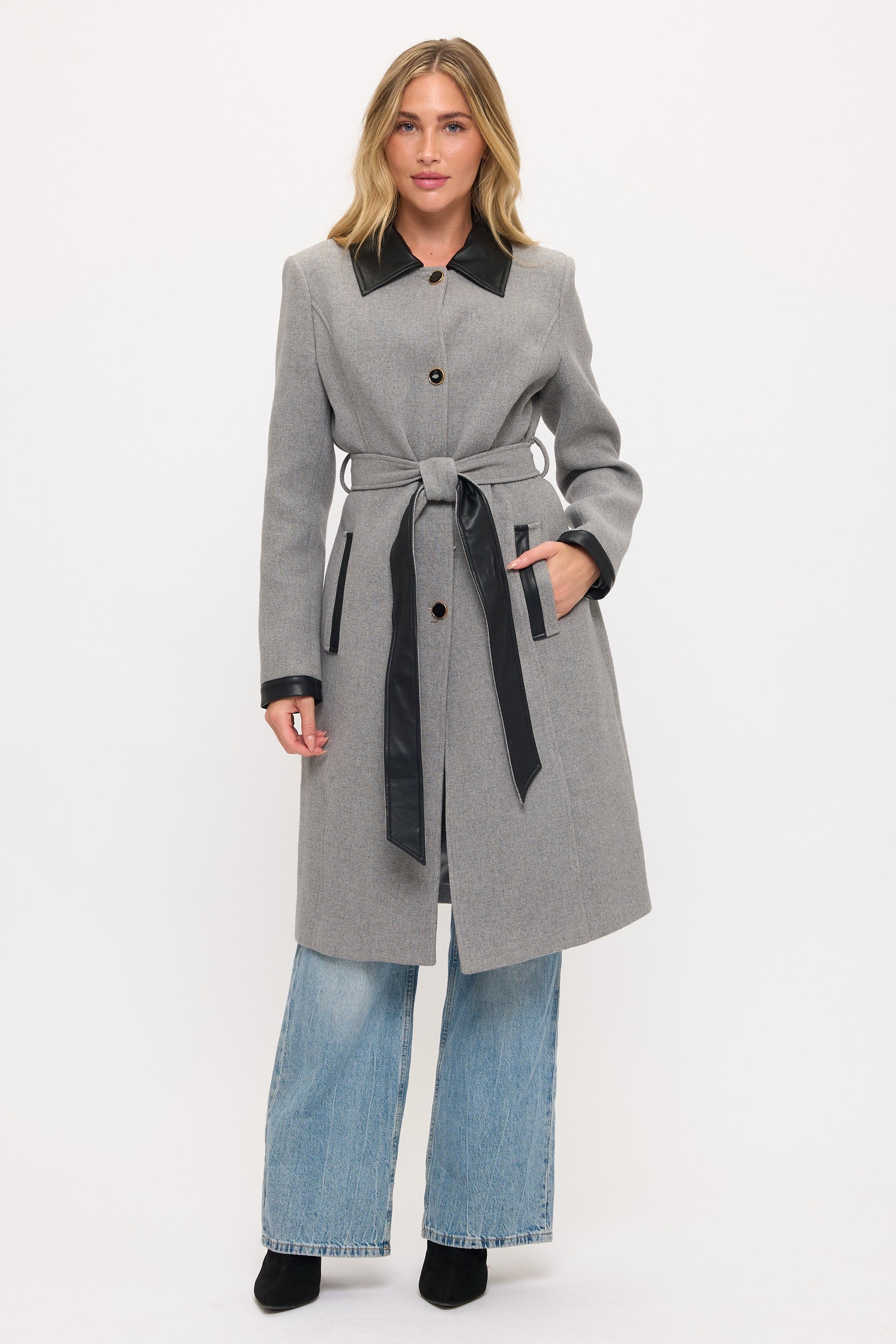 This floor-length coat blends timeless elegance with modern design. Made from a soft, durable faux wool, it features a sleek contrast trim and a tailored silhouette that flatters the figure. A classic collar and button-front closure add sophistication, while a self-tie belt and cuff accents bring contemporary style. Ideal for day or evening wear, it offers warmth, comfort, and a polished, fashion-forward statement.