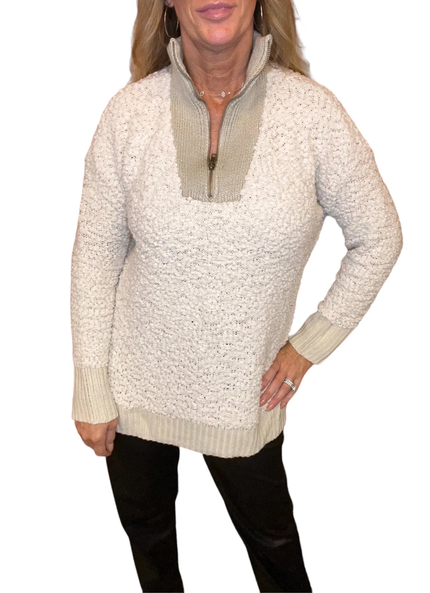 Perfect for chilly days, this soft, long sleeve sweater features oatmeal and khaki tones, with a convenient half-zip design.